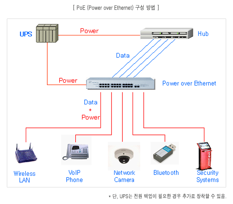 PoE란 표준 이더넷 인프라 구조에서 UTP 케이블을 이용하여 데이터와 전원을 함께 보낸다. 이는 기존의 UTP Cat 3. CAT5. CAT6. 케이블을 활용하여 전원을 함께 실어 보냄. 2003년 6월 IEEE 802.3af 표준으로 제정됨